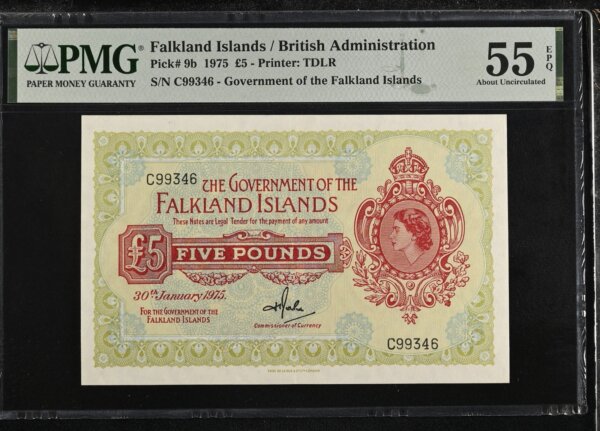 FALKLAND ISLANDS 5 POUNDS 1960 P9b ABOUT UNC PMG GRADED – 55 EPQ